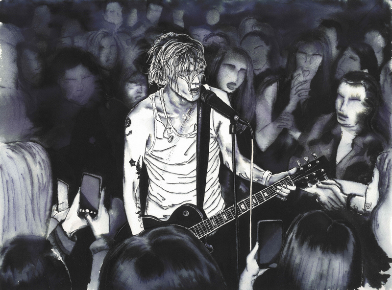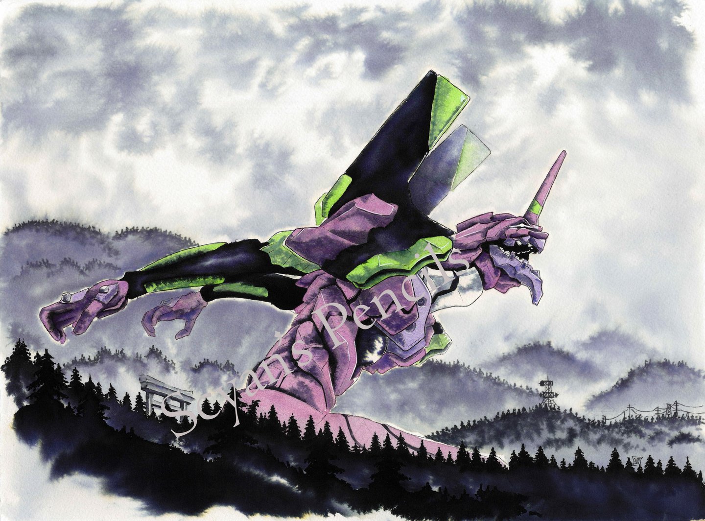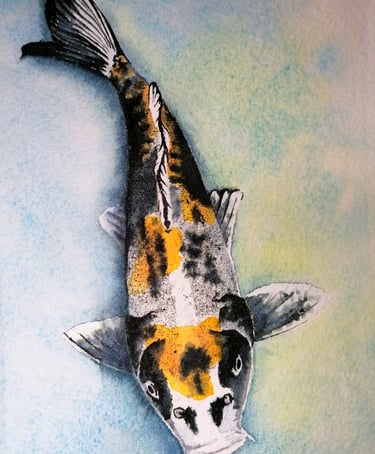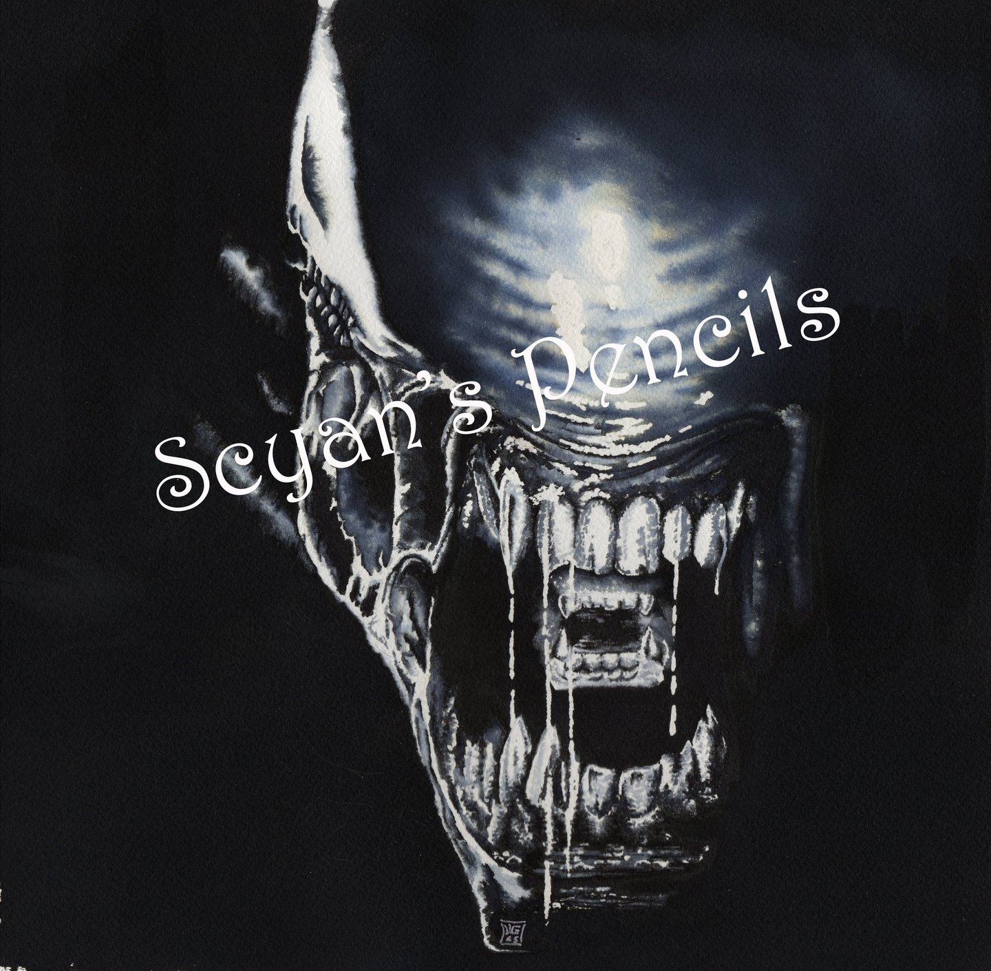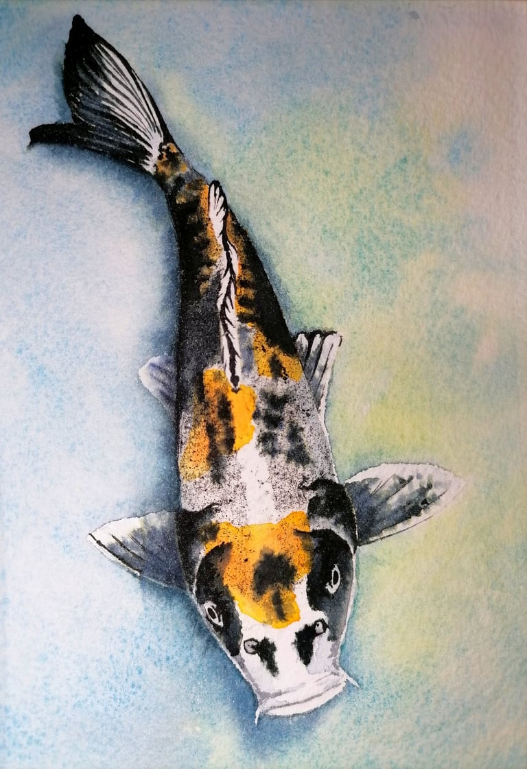 L'écoline noire permet cette intensité dans les teintes sombres et ces variantes bleutées ou jaunes là où elle se diffuse dans l'eau.